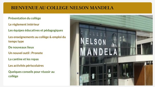 Le collège Nelson MANDELA accueille 580 élèves de la 6ème à la 3ème répartis dans 29 classes : - 7 classes de 6ème (147 élèves) - 7 classes de 5ème (137 élèves) - 7 classes de 4ème (131 élèves) - 8 classess de 3ème (159 élèves) Le collège dispose : - d'une Section d'Enseignement Général et Professionnel Adapté (SEGPA) : 4 classes - d'une Unité Localisée pour l'Inclusion Scloaire (ULIS) : 1 groupe - d'une Unité Pédagogique pour Elèves Allophones Arrivants (UPE2A) : 2 groupes Options proposées au collège : A partir de la 6ème :- Espagnol bilangue - Chorale A partir de la 5ème : - LV2 allemand ou Espagnol - Langues et cultures antiques (latin et grec) - Langues et cultures européennes (anglais)