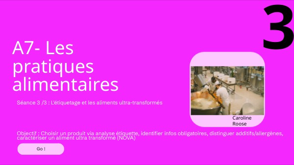 Séance 3 /3 : L'étiquetage et les aliments ultra-transformés Objectif : Choisir un produit via analyse étiquette, identifier infos obligatoires, distinguer additifs/allergènes, caractériser un aliment ultra transformé (NOVA)