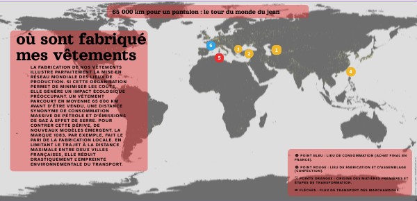 🔵 Point bleu : Lieu de consommation (achat final en France). 🔴 Point rouge : Lieu de fabrication et d'assemblage (confection). 🟠 Points oranges : Origine des matières premières et étapes de transformation. ➡️ Flèches : Flux de transport des marchandises.