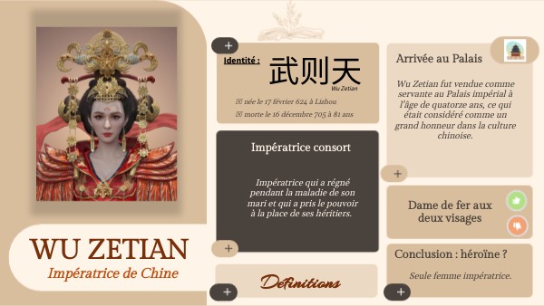 - Arrivée à 14 ans en tant que servante - Concubine de l'empereur Gaozong avec qui elle a 4 enfants - Plan machiavélique pour évincer, l'impératrice Wang, la femme de Gaozong