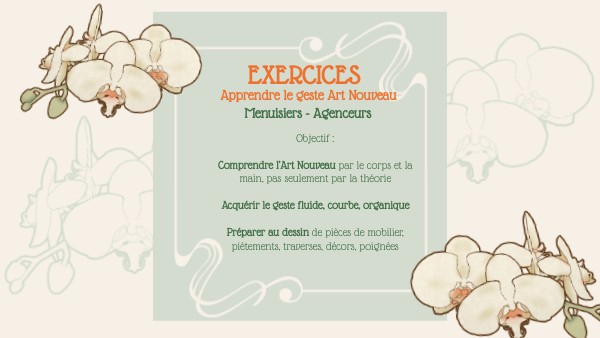 Objectif :Comprendre l’Art Nouveau par le corps et la main, pas seulement par la théorieAcquérir le geste fluide, courbe, organiquePréparer au dessin de pièces de mobilier, piètements, traverses, décors, poignées