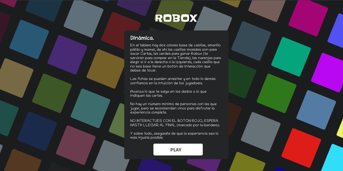 En el tablero hay dos colores base de casillas, amarillo pálido y mamei, de ahí las casillas moradas son para sacar Cartas, las verdes para ganar Robux (te servirán para comprar en la Tienda), las naranjas para elegir si ir a la derecha o la izquierda, cada casilla que no sea base tiene un botón de interacción que debes de tocar. Las fichas se pueden arrastrar y en todo lo demás confiamos en la intuición de los jugadores. IAvanza lo que te salga en los dados o lo que indiquen las cartas. No hay un número mínimo de personas con las que jugar, pero se recomiendan cinco para disfrutar la experiencia completa. NO INTERACTÚES CON EL BOTÓN ROJO, ESPERA HASTA LLEGAR AL FINAL (marcado por la bandera). Y sobre todo, asegúrate de que la experiencia sea lo más injusta posible.