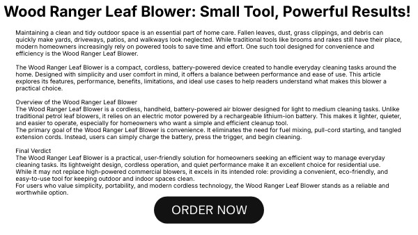 Maintaining a clean and tidy outdoor space is an essential part of home care. Fallen leaves, dust, grass clippings, and debris can quickly make yards, driveways, patios, and walkways look neglected. While traditional tools like brooms and rakes still have their place, modern homeowners increasingly rely on powered tools to save time and effort. One such tool designed for convenience and efficiency is the Wood Ranger Leaf Blower. The Wood Ranger Leaf Blower is a compact, cordless, battery-powered device created to handle everyday cleaning tasks around the home. Designed with simplicity and user comfort in mind, it offers a balance between performance and ease of use. This article explores its features, performance, benefits, limitations, and ideal use cases to help readers understand what makes this blower a practical choice. Overview of the Wood Ranger Leaf Blower The Wood Ranger Leaf Blower is a cordless, handheld, battery-powered air blower designed for light to medium cleaning tasks. Unlike traditional petrol leaf blowers, it relies on an electric motor powered by a rechargeable lithium-ion battery. This makes it lighter, quieter, and easier to operate, especially for homeowners who want a simple and efficient cleanup tool. The primary goal of the Wood Ranger Leaf Blower is convenience. It eliminates the need for fuel mixing, pull-cord starting, and tangled extension cords. Instead, users can simply charge the battery, press the trigger, and begin cleaning. Final Verdict The Wood Ranger Leaf Blower is a practical, user-friendly solution for homeowners seeking an efficient way to manage everyday cleaning tasks. Its lightweight design, cordless operation, and quiet performance make it an excellent choice for residential use. While it may not replace high-powered commercial blowers, it excels in its intended role: providing a convenient, eco-friendly, and easy-to-use tool for keeping outdoor and indoor spaces clean. For users who value simplicity, portability, and modern cordless technology, the Wood Ranger Leaf Blower stands as a reliable and worthwhile option.