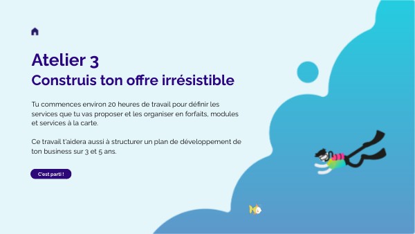 Tu commences environ 20 heures de travail pour définir les services que tu vas proposer et les organiser en forfaits, modules et services à la carte. Ce travail t'aidera aussi à structurer un plan de développement de ton business sur 3 et 5 ans.
