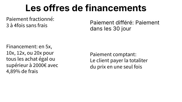 Financement: en 5x, 10x, 12x, ou 20x pour tous les achat égal ou supérieur à 2000€ avec 4,89% de frais