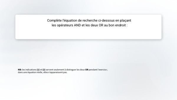 Complète l’équation de recherche ci-dessous en plaçant les opérateurs AND et les deux OR au bon endroit :