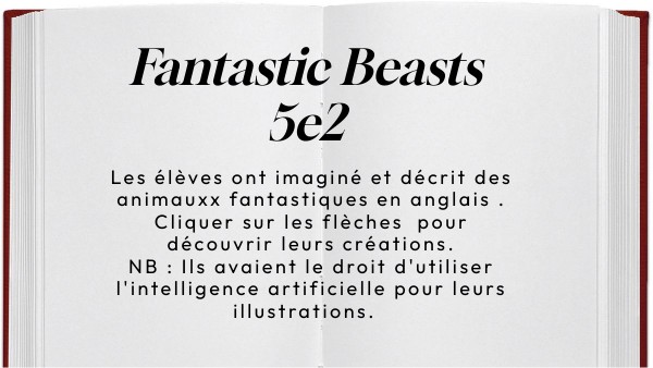 Les élèves ont imaginé et décrit des animauxx fantastiques en anglais .Cliquer sur les flèches pour découvrir leurs créations. NB : Ils avaient le droit d'utiliser l'intelligence artificielle pour leurs illustrations.