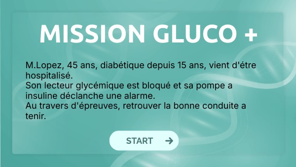 M.Lopez, 45 ans, diabétique depuis 15 ans, vient d'étre hospitalisé. Son lecteur glycémique est bloqué et sa pompe a insuline déclanche une alarme. Au travers d'épreuves, retrouver la bonne conduite a tenir.