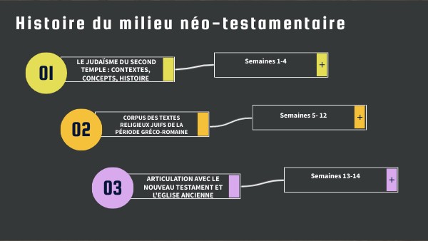 Définitions : 1) judaïsme ancien – judaïsme tardif – Middle Judaism ; 2) intertestamentaires, pseudépigraphes, apocryphes. 3) NT dans la perspective «within Judaism»