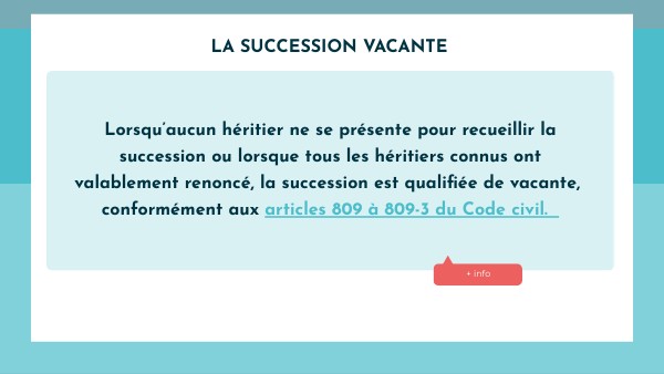 Lorsqu’aucun héritier ne se présente pour recueillir la succession ou lorsque tous les héritiers connus ont valablement renoncé, la succession est qualifiée de vacante, conformément aux articles 809 à 809-3 du Code civil.