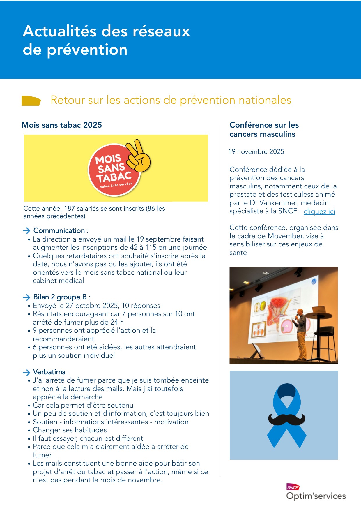 Conférence dédiée à laprévention des cancersmasculins, notamment ceux de laprostate et des testiculess animépar le Dr Vankemmel, médecinspécialiste à la SNCF :Cette conférence, organisée dansle cadre de Movember, vise àsensibiliser sur ces enjeux desanté