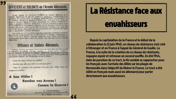 Depuis la capitulation de la France et le début de la collaboration le 22 juin 1940, un réseau de résistance s'est créé à l'étranger et en France à l'appel du Général de Gaulle. La France, à la suite de la création de ce réseau de résistants, regagne espoir et retrouve un second souffle. En été 1944, date de parution de ce tract, la fin semble se rapprocher pour les français avec l'arrivée des Alliés sur les plages de Normandie dans l'objectif de libérer la France. Le tract a été édité en français mais aussi en allemand pour parler directement aux envahisseurs.