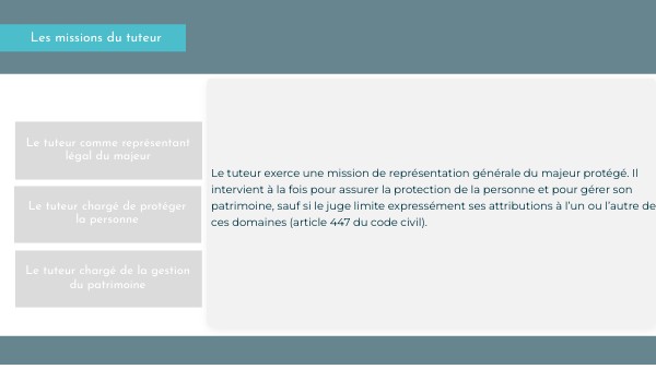 Le tuteur exerce une mission de représentation générale du majeur protégé. Il intervient à la fois pour assurer la protection de la personne et pour gérer son patrimoine, sauf si le juge limite expressément ses attributions à l’un ou l’autre de ces domaines (article 447 du code civil).