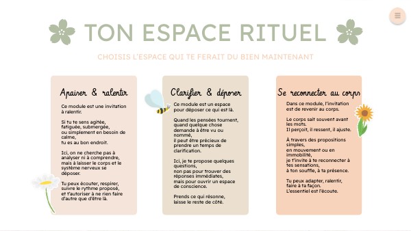 Si, après ce temps, tu ressens le besoin de : – déposer ce qui te traverse – mettre des mots sur ce qui est là – ou explorer autrement tu peux revenir à l’espace rituel et choisir un autre module. Il n’y a pas d’ordre à respecter. Écoute simplement ce qui est juste pour toi maintenant.