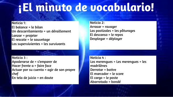 Noticia 1: El balance = le bilan Un descarrilamiento = un déraillement Lanzar = projeter El rescate = le sauvetage Los supervivientes = les survivants