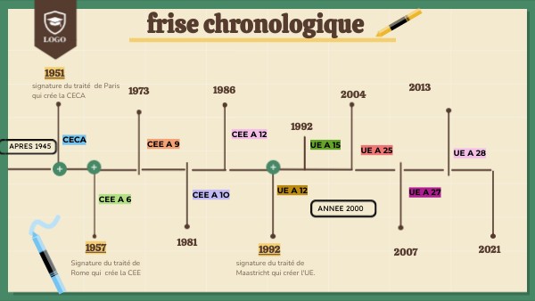 la construction europpeene debute en 1951 avec la CECA. En 1957, le traité de Rome fonde la CEE ( communautée economique européene ) qui veut etablir un marché commun. En 1973, la CEE s'elargit peu a peu pour le premier fais avec l'entrée du Royaume- unis, de l'Irlande et du Danemark. En 1986, l'Espagne et le Portugal rejoignent la CEE