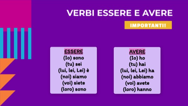 ESSERE (Io) sono (tu) sei (lui, lei, Lei) è (noi) siamo (voi) siete (loro) sono
