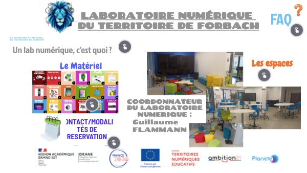 Le Laboratoire Numérique du territoire de FORBACH est l'un des 17 Laboratoires Numériques de l'Académie de Nancy-Metz. Il est hebergé au lycée Condorcet de SCHOENECK. Il accompagne les professeurs et les élèves de la maternelle au lycée dans leurs projets nécessitant l'usage d'outils numériques : - accompagnement humain dans le montage de projets -formations aux usages du numérique -accueil de groupes ou interventions dans les établissements -prêt de matériel et aide à la prise en main pour vos projets en classe, vos expérimentations...