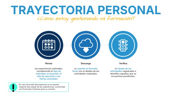En caso de existir discrepancias en el reporte respecto del estado de las experiencias, comunícate con Formación Continua para su revisión.