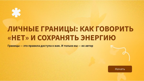 Границы — это твой способ оставаться собой в любой ситуации. Возвращайся сюда, когда мир будет шуметь слишком громко. Помни: твоё спокойствие — не эгоизм, а основа, на которой строится всё остальное. Ты научился(ась) главному — слышать себя. Дальше — практика...
