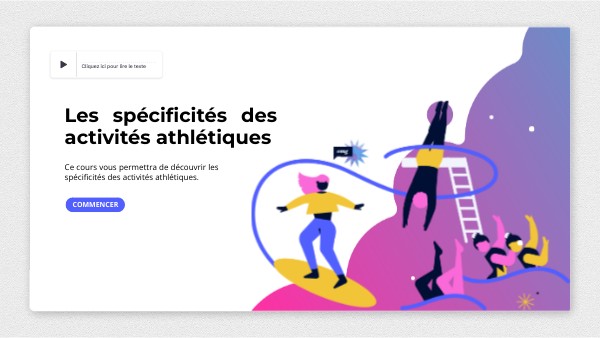 Ce cours vous a permis de découvrir les spécificités des activités athlétiques. Vous pouvez poursuivre avec les questions suivantes qui vous permettront de voir ce que vous avez retenu. Si vous êtes en plein écran, revenez sur l'écran principal pour cliquer sur la croix de fermeture.