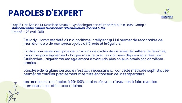 D'après ler livre de Dr Dorothee Struck - Gynécologue et naturopathe, sur le Lady-Comp : Anticonceptie zonder hormonen: alternatieven voor Pil & Co. Broché – 23 avril 2019