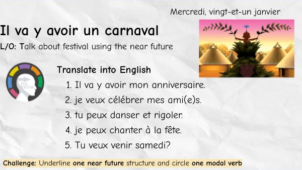 Imagine you are going to the carnival with Kirikou Design your own carnival costume and mask on paper. Then, write 5 sentences in French: 3 × je vais + infinitive 1 × il va y avoir 1 opinion + reason (parce que…) to describe your carnival day