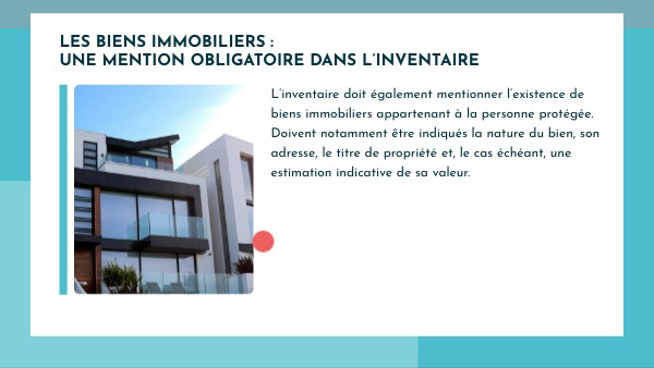 L’inventaire doit également mentionner l’existence de biens immobiliers appartenant à la personne protégée. Doivent notamment être indiqués la nature du bien, son adresse, le titre de propriété et, le cas échéant, une estimation indicative de sa valeur.