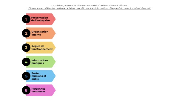 Ce schéma présente les éléments essentiels d’un livret d’accueil efficace. Cliquez sur les différentes parties du schéma pour découvrir les informations clés que doit contenir un livret d’accueil.
