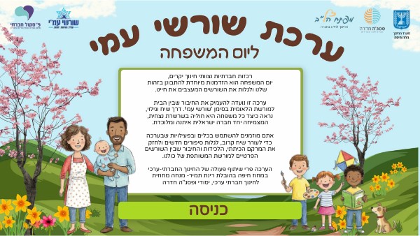 רכזות חברתיות וצוותי חינוך יקרים, יום המשפחה הוא הזדמנות מיוחדת להתבונן בזהות שלנו ולגלות את השורשים המעצבים את חיינו. ערכה זו נועדה להעמיק את החיבור שבין הבית למורשת הלאומית בסימן 'שורשי עמי'. דרך שיח וגילוי, נראה כיצד כל משפחה היא חוליה בשרשרת נצחית, המצמיחה יחד חברה ישראלית איתנה ומלוכדת. אתם מוזמנים להשתמש בכלים ובפעילויות שבערכה כדי לעורר שיח קרוב, לגלות סיפורים חדשים ולחזק את המרקם הכיתתי, הלכידות והחיבור שבין השורשים הפרטיים למורשת המשותפת של כולנו. הערכה פרי שיתוף פעולה של החינוך החברתי-ערכי במחוז חיפה בהובלת רינת תמיר- מנחה מחוזית לחינוך חברתי ערכי, יסודי ופסג"ה חדרה