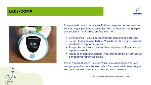 Phase d’apprentissage : Les 3 premiers mois d’utilisation, le Lady-comp apprend à connaitre vos cycles. C’est au bout du 4e mois que vous pourrez avoir des rapports sexuels sans préservatif.Source : www.lesamazonesparisiennes.com