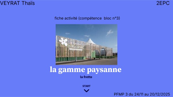 J'ai effecuté ma PFMP3 du 24 novembre au 20 décembre 2025. Je l'ai faite à la Gamme Paysanne qui est située à la Frette. C'est un magasin qui vend des produits fermiers. J'ai travaillé sur l'ensemble des postes en magasin . Ils travaillent avec le bouquet paysan qui est à APRIEU