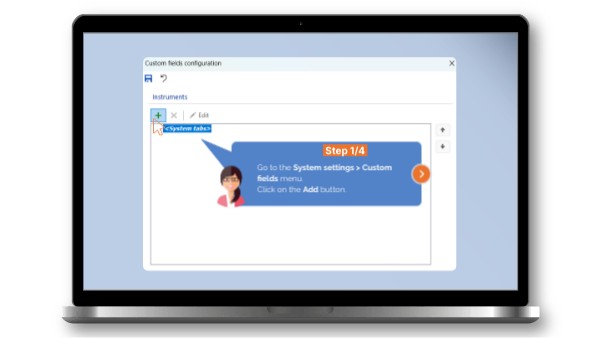 Enter the name of the tab that will appear on the Instruments form, together with the name of the field in this form.Select the desired field type.