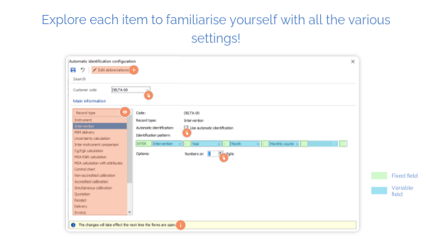 Click here to define the abbreviations if one of the following items has been used in the Automatic identification format: Designation, Measurement domain, Instrument family, Type, Intervention and Technician. Select the code and its associated abbreviation type, then enter the abbreviation for the desired items.