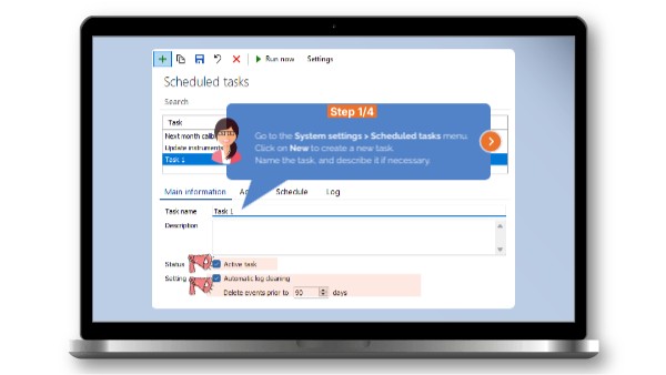 Go to the System settings > Scheduled tasks menu.Click on New to create a new task.Name the task, and describe it if necessary.