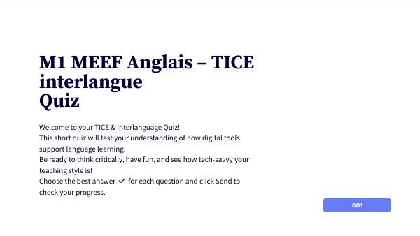 Welcome to your TICE & Interlanguage Quiz! This short quiz will test your understanding of how digital tools support language learning. Be ready to think critically, have fun, and see how tech-savvy your teaching style is! Choose the best answer ✅ for each question and click Send to check your progress.