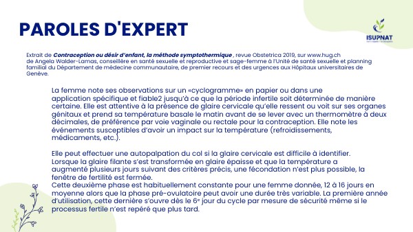 Extrait de Contraception ou désir d’enfant, la méthode symptothermique , revue Obstetrica 2019, sur www.hug.ch de Angela Walder-Lamas, conseillère en santé sexuelle et reproductive et sage-femme à l’Unité de santé sexuelle et planning familial du Département de médecine communautaire, de premier recours et des urgences aux Hôpitaux universitaires de Genève.