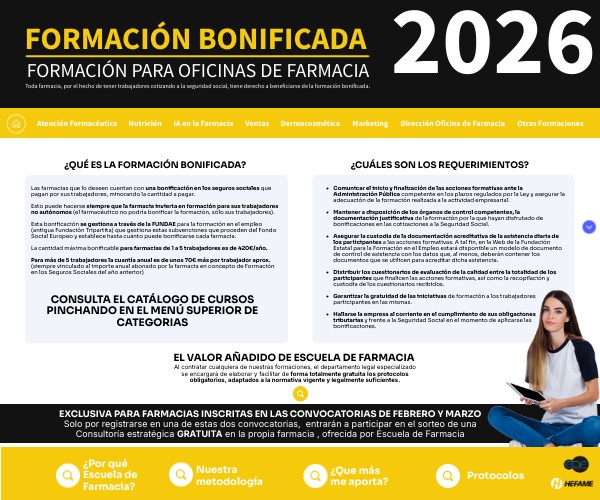 Por lo tanto, el equipo y titular obtienen conocimientos profesionales, actualizados y acreditados por la formación recibida que tiene coste de 0€. Escuela de Farmacia se encarga de toda la gestión de la documentación, así como de justificar la bonificación ante el organismo competente en caso de inspección sin ningún coste extra.La formación bonificada no aplica a los trabajadores autónomos, pero HEFAME y Escuela de Farmacia regalan la matriculación de todos los integrantes del equipo de la farmacia al curso seleccionado incluido el titular, sin aplicar ningún coste extra, con accesos independientes para cada uno de ellos.