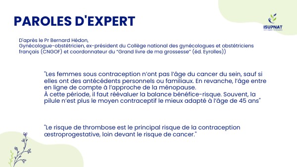 "Les femmes sous contraception n’ont pas l’âge du cancer du sein, sauf si elles ont des antécédents personnels ou familiaux. En revanche, l’âge entre en ligne de compte à l’approche de la ménopause. À cette période, il faut réévaluer la balance bénéfice-risque. Souvent, la pilule n’est plus le moyen contraceptif le mieux adapté à l’âge de 45 ans" "Le risque de thrombose est le principal risque de la contraception œstroprogestative, loin devant le risque de cancer."