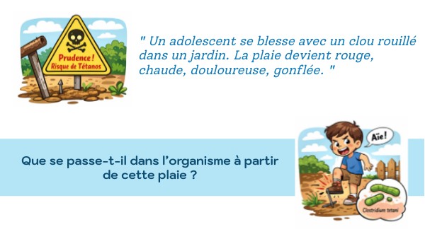 " Un adolescent se blesse avec un clou rouillé dans un jardin. La plaie devient rouge, chaude, douloureuse, gonflée. "