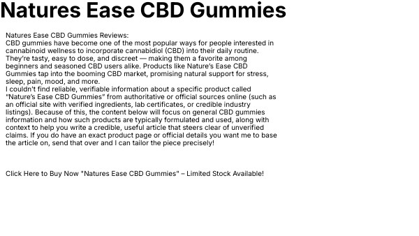 Natures Ease CBD Gummies Reviews: CBD gummies have become one of the most popular ways for people interested in cannabinoid wellness to incorporate cannabidiol (CBD) into their daily routine. They’re tasty, easy to dose, and discreet — making them a favorite among beginners and seasoned CBD users alike. Products like Nature’s Ease CBD Gummies tap into the booming CBD market, promising natural support for stress, sleep, pain, mood, and more. I couldn’t find reliable, verifiable information about a specific product called “Nature’s Ease CBD Gummies” from authoritative or official sources online (such as an official site with verified ingredients, lab certificates, or credible industry listings). Because of this, the content below will focus on general CBD gummies information and how such products are typically formulated and used, along with context to help you write a credible, useful article that steers clear of unverified claims. If you do have an exact product page or official details you want me to base the article on, send that over and I can tailor the piece precisely! Click Here to Buy Now "Natures Ease CBD Gummies" – Limited Stock Available!
