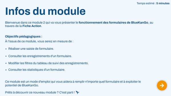 Bienvenue dans ce module 2 qui va vous présenter le fonctionnement des formulaires de BlueKanGo, au travers de la Fiche Action.