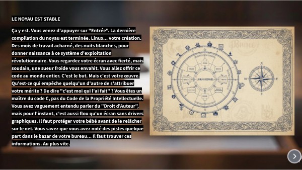Ça y est. Vous venez d'appuyer sur "Entrée". La dernière compilation du noyau est terminée. Linux... votre création. Des mois de travail acharné, des nuits blanches, pour donner naissance à ce système d'exploitation révolutionnaire. Vous regardez votre écran avec fierté, mais soudain, une sueur froide vous envahit. Vous allez offrir ce code au monde entier. C'est le but. Mais c'est votre œuvre. Qu'est-ce qui empêche quelqu'un d'autre de s'attribuer votre mérite ? De dire "c'est moi qui l'ai fait" ? Vous êtes un maître du code C, pas du Code de la Propriété Intellectuelle. Vous avez vaguement entendu parler du "Droit d'Auteur", mais pour l'instant, c'est aussi flou qu'un écran sans drivers graphiques. Il faut protéger votre bébé avant de le relâcher sur le net. Vous savez que vous avez noté des pistes quelque part dans le bazar de votre bureau... Il faut trouver ces informations. Au plus vite.