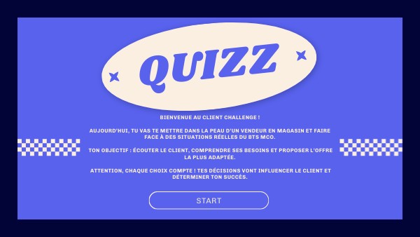 Bienvenue au Client Challenge ! Aujourd’hui, tu vas te mettre dans la peau d’un vendeur en magasin et faire face à des situations réelles du BTS MCO. Ton objectif : écouter le client, comprendre ses besoins et proposer l’offre la plus adaptée. Attention, chaque choix compte ! Tes décisions vont influencer le client et déterminer ton succès.