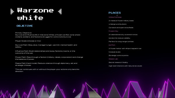Primary Objective:Survive and influence life in Warzone White, a frozen conflict zone where civilians, soldiers, and factions struggle for control and survival.Player Goals (choose or mix):Survival Path: Stay alive, manage hunger, warmth, mental health, and safety.Influence Path: Build relationships and sway factions, towns, or the outcome of the war.Power Path: Rise through a faction (military, rebels, corporation) and change the balance of power.Peace Path (hard mode): Reduce violence through diplomacy, aid, and strategic choices.The war continues with or without the player—your actions only bend its direction.