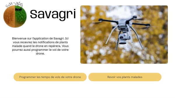 Bienvenue sur l'application de Savagri. Ici vous recevrez les notifications de plants malade quand le drone en repérera. Vous pourrez aussi programmer le vol de votre drone.