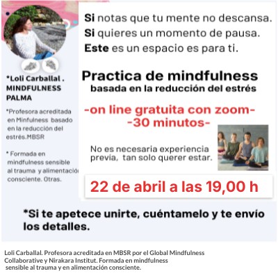 Loli Carballal. Profesora acreditada en MBSR por el Global Mindfulness Collaborative y Nirakara Institut. Formada en mindfulness sensible al trauma y en alimentación consciente.