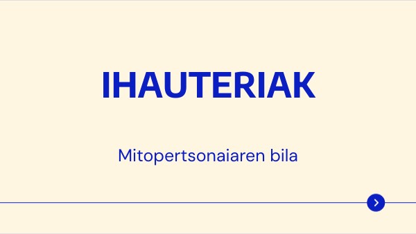 Ikastetxean, aurtengo ihauterietarako gaia EUSKAL MITOLOGIA izango da eta zuen taldean mozorro bat prestatu beharko duzue. Horretarrako, ikasleok, euskal mitologiako pertsonaia baten inguruko informazioa bildu (ezaugarriak, kondairak, irudiak), aurkezpen labur bat sortu, eta guztion artean, bozketa bidez zein pertsonaiaz mozorrotuko zareten erabakiko duzue.