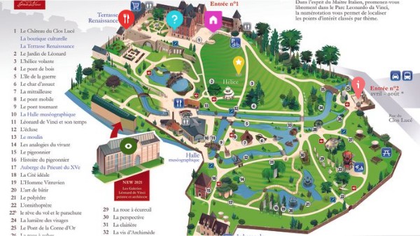 Dans le Jardin de Léonard, découvrez l’influence de la Nature sur son œuvreAutodidacte, c’est en observant la Nature dans laquelle il trouve des réponses que, loin des livres, Léonard de Vinci élabore un nouveau mode d’apprentissage en étant l’un des premiers à inventer la science expérimentale.Dans le Parc Leonardo da Vinci, expérimentez l’univers créatif du Maître Lors de cette promenade culturelle, vous découvrez Léonard ingénieur, Léonard visionnaire et Léonard peintre et architecte. Dans le parc, montez à bord du char d’assaut, actionnez la vis aérienne, manipulez la mitrailleuse, promenez-vous en bateau à aubes, franchissez le pont tournant ou le célèbre pont à double travée de vingt mètres de haut, réalisés avec les techniques de l’époque. Toutes ces maquettes sont à taille réelle pour offrir aux petits et grands des expériences pratiques et vérifier les intuitions de Léonard.