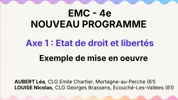 Attendus et objectifs : La classe de quatrième s’attache à approfondir le sens du premier principe de la devise de la République : la liberté. Il s’agit de faire comprendre aux élèves comment la liberté se décline dans les libertés et comment celles-ci s’inscrivent dans un cadre légal qui les sauvegarde tout en les limitant au nom de l’intérêt général. La loi et l’organisation de la justice sont abordées comme des instruments en vue de la protection des individus, en tant qu’elles permettent de pallier les atteintes à leurs libertés et de maintenir l’ordre public garanti par l’État au nom de l’intérêt général de la Nation.